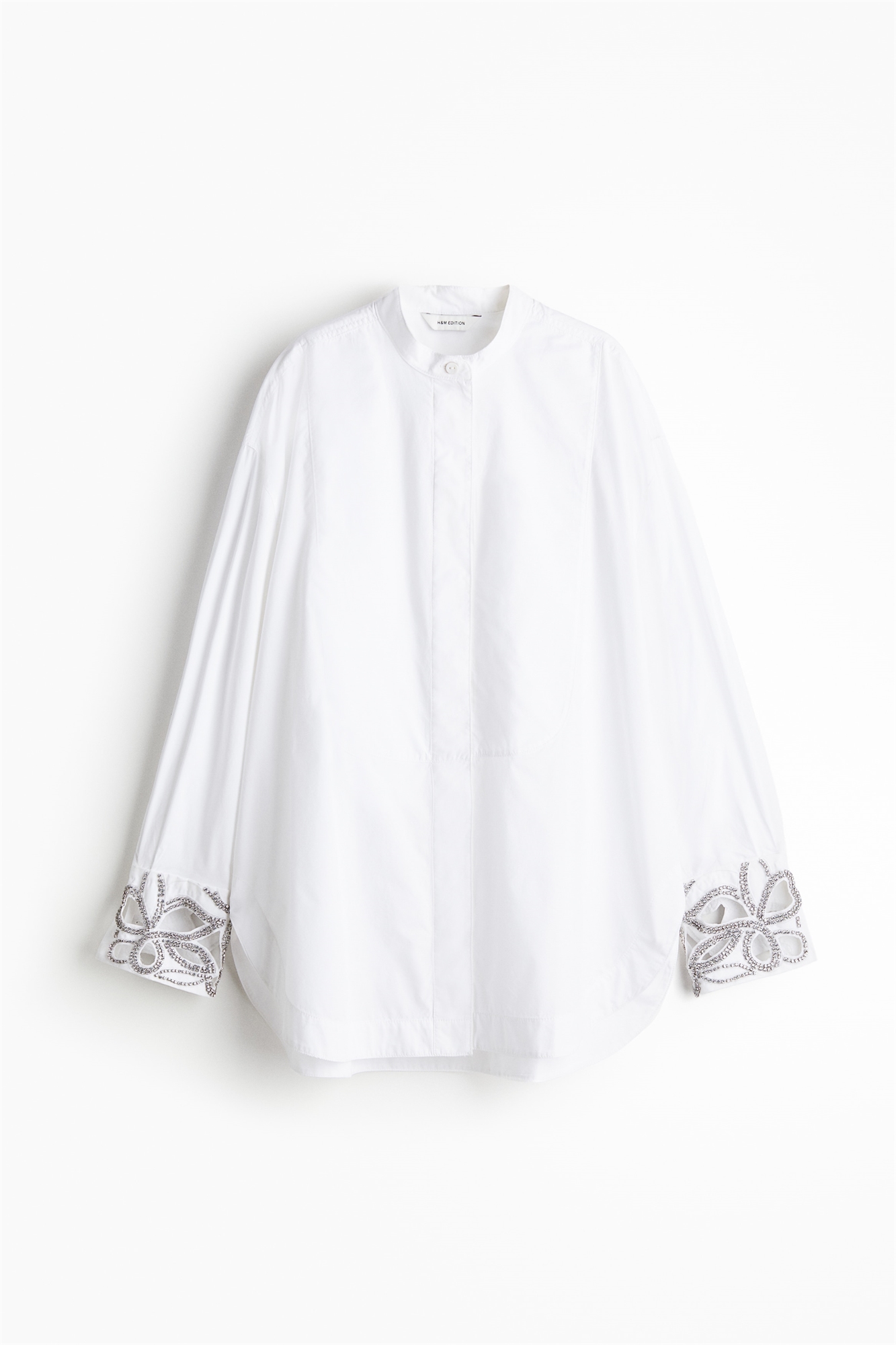 Рубашка оверсайз из хрустящего хлопкового поплина с воротником-бантом, нагрудником спереди и потайными пуговицами спереди. Двухслойное ярмо с коробчатой складкой сзади, спущенные плечи и длинные рукава с широкими манжетами из бродери-англиз, украшенными сверкающими стразами. Закругленный подол с разрезом с каждой стороны.