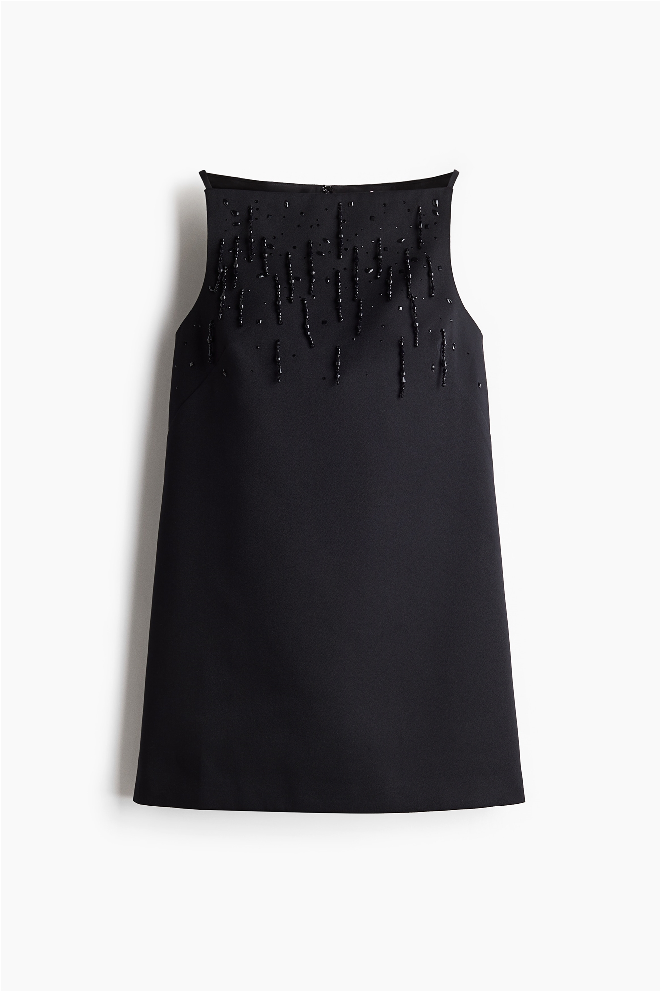 Мини-платье без рукавов из саржи, украшенное сверкающими стразами и нитями бисера спереди. А-линия силуэта с квадратным вырезом, узкими бретелями и потайной застежкой-молнией сзади. Подкладка из тафты.