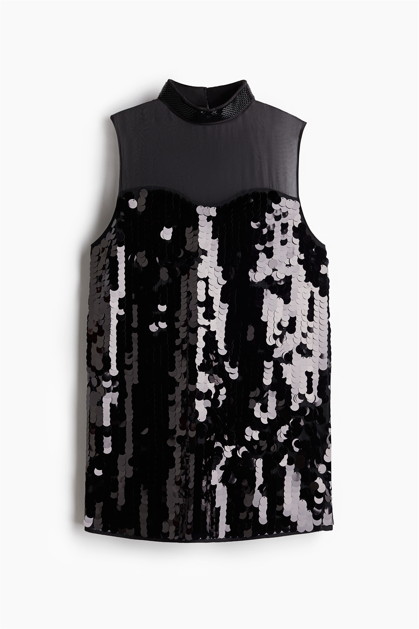 Короткое платье без рукавов из сетки, украшенной крупными пайетками. Верхняя часть из полотняного переплетения с отверстием для ключа сзади и воротником-стойкой, украшенным бусинами и потайными застежками-крючками сзади. Подкладка из джерси.