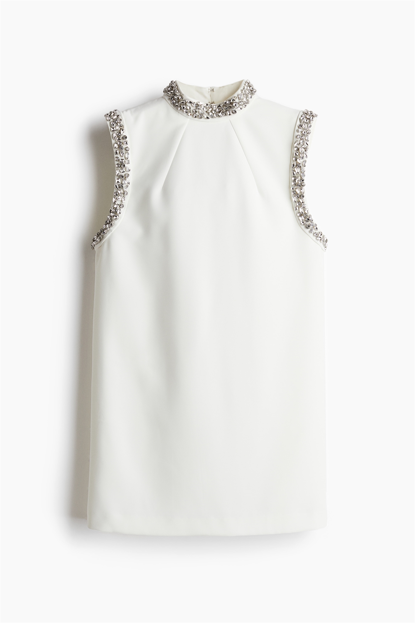 Короткое платье без рукавов из тканого материала с воротником-стойкой и проймами, украшенными сверкающими стразами. Отверстие для ключа со скрытыми застежками-крючками сзади на шее. Диагональные вытачки спереди и незаметные карманы в боковых швах. Атласная подкладка.