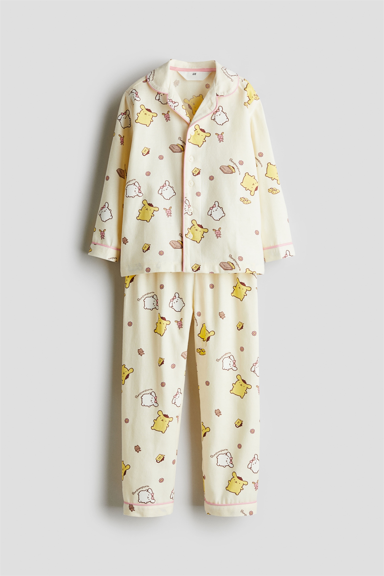 H&M x Hello Kitty and Friends. Веселая и яркая коллекция с уютными фасонами, милыми принтами и игривыми аксессуарами. Откройте для себя мир Hello Kitty и всех наших пушистых любимцев! Пижама с рубашкой и нижней частью из мягкой хлопковой фланели с рисунком по всей поверхности и акцентной цветной отделкой. Рубашка с отложным воротником, застежкой на пуговицы спереди, спущенными плечами и длинными рукавами с манжетами. Низ с эластичной талией и прямыми ногами с манжетами на подоле.
