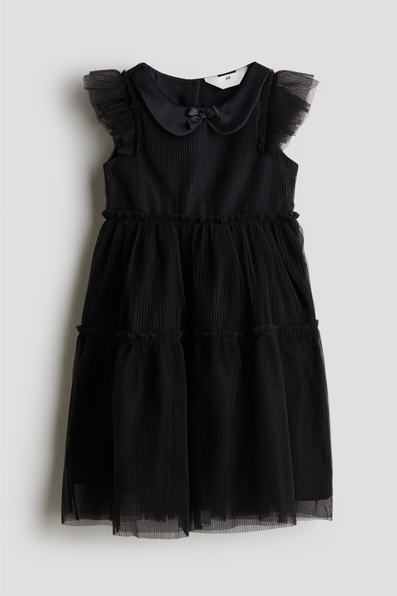 Платье из плиссированного тюля с округлым атласным воротником и аппликацией в виде банта спереди. Рукава-воланчики, пуговицы на спине и шов с оборкой на талии и на юбке. На подкладке.