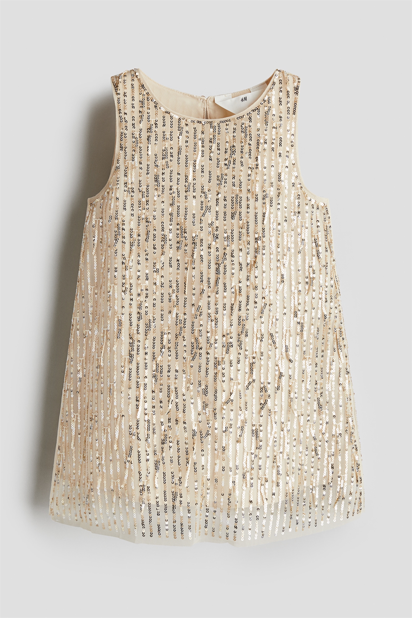 Платье А-силуэта из сетки с пайетками и бахромой из пайеток. Круглый вырез и застежка на пуговицу сзади. На подкладке.