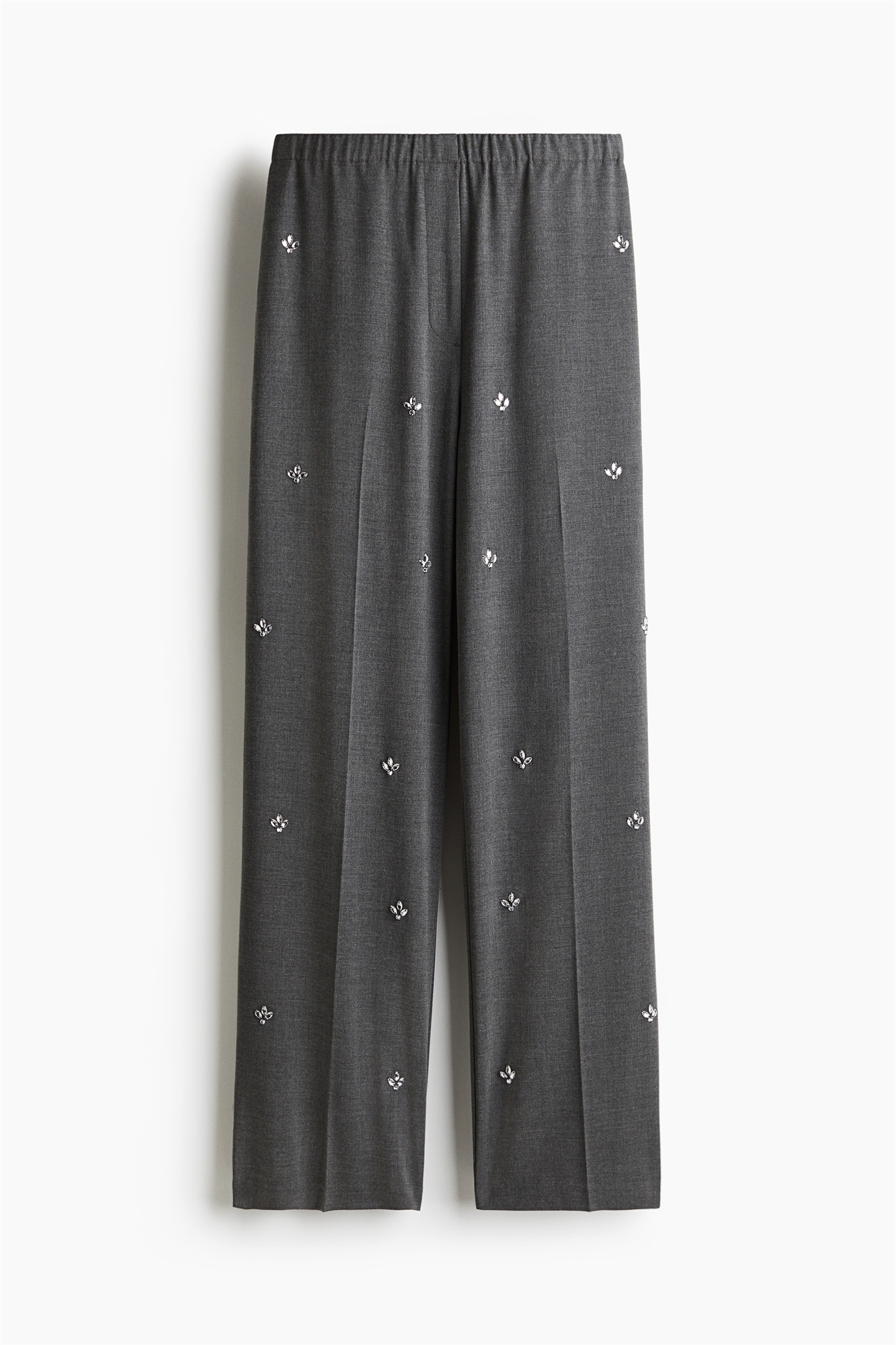 Свободные брюки из тканого материала, украшенные сверкающими стразами. Высокая талия с утяжкой, фальшивая ширинка, незаметные боковые карманы и фальшивые накладные карманы сзади. Прямые ноги со складками спереди и сзади.