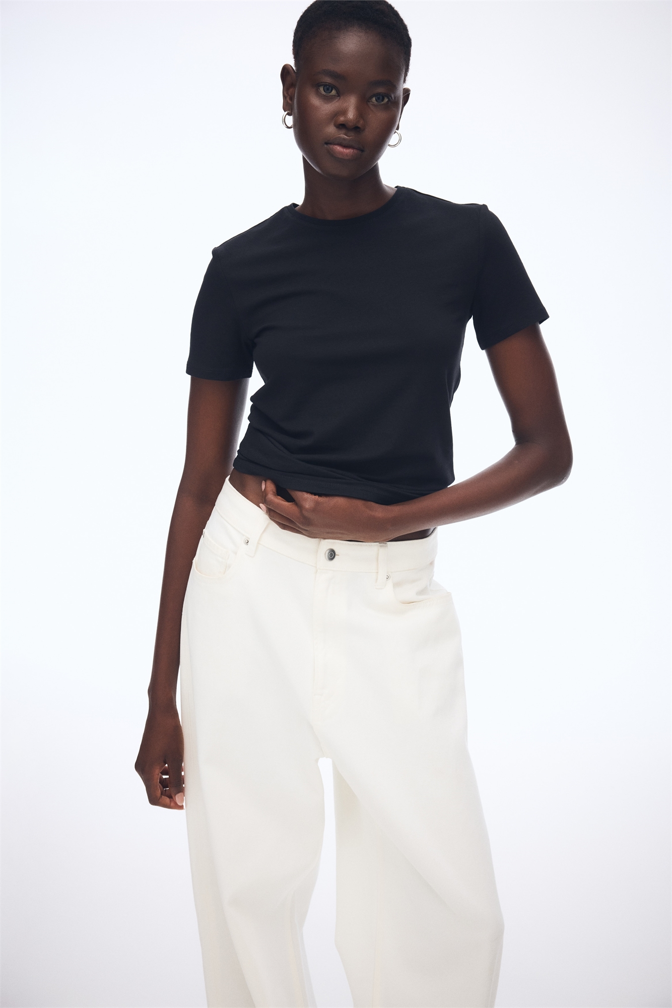 Облегающая футболка из хлопкового джерси-стрейч с узкой окантовкой по вырезу горловины и прямым покроем.