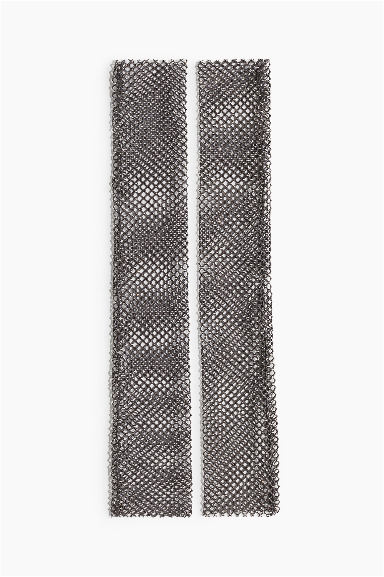 Перчатки из сеточки без пальцев украшены блестящими стразами. Отверстия для больших пальцев и необработанные края. Длина 44 см.