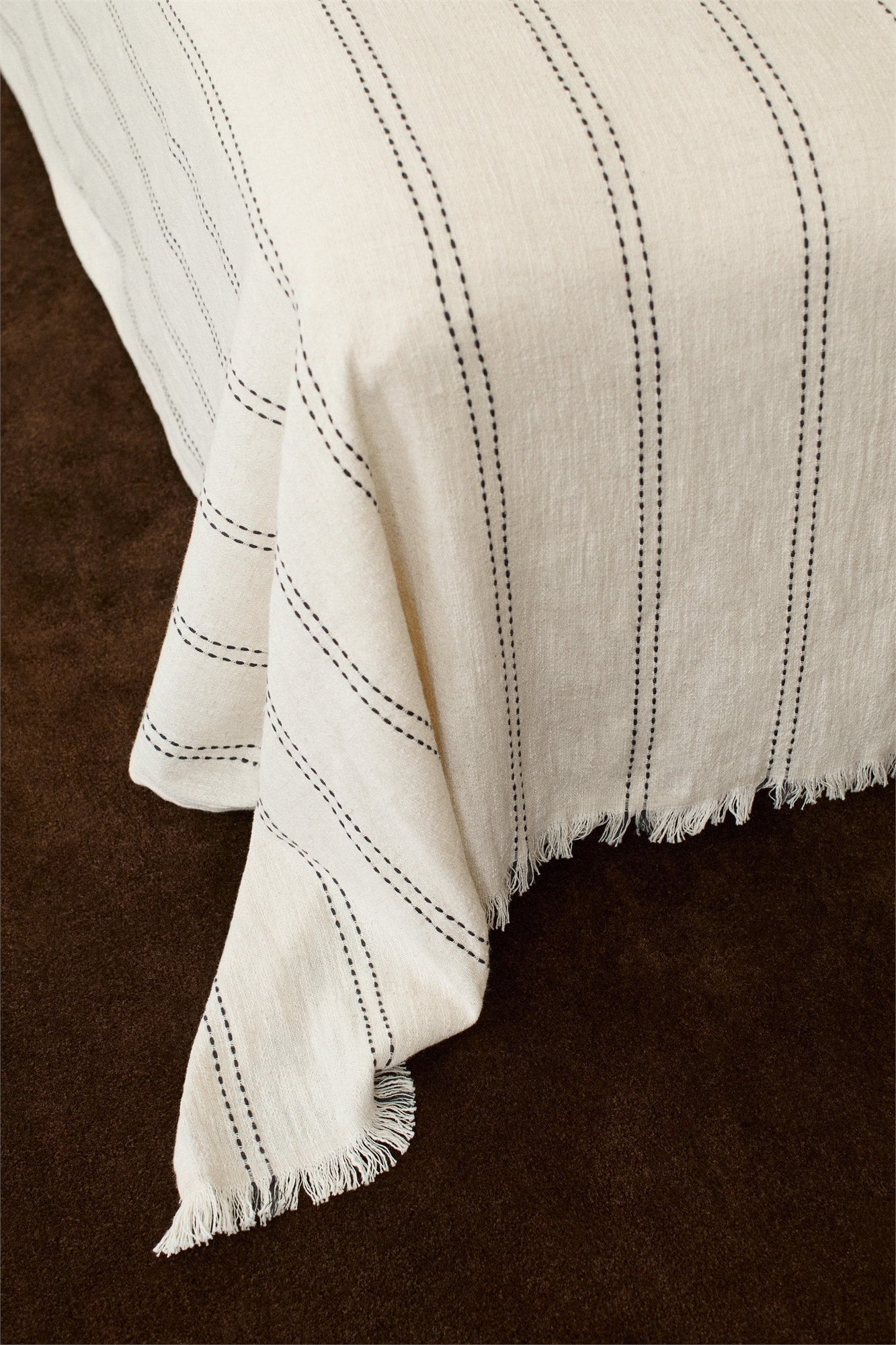 Покрывало с мягким плетением из смеси хлопка. Тонкая текстура, строчка контрастного цвета и бахрома по коротким сторонам.