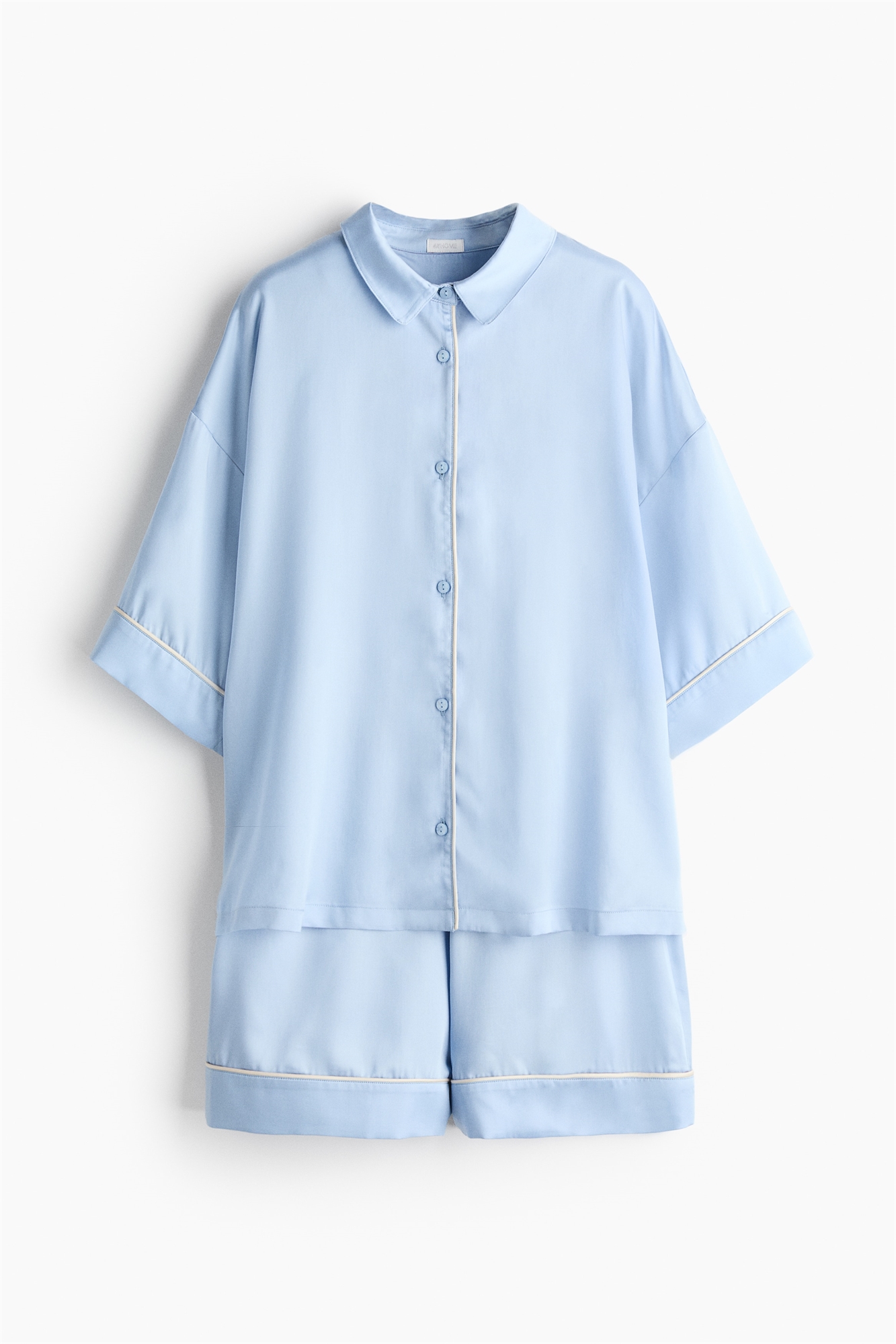Пижама с рубашкой и шортами из мягкого сатина с контрастной цветной отделкой. Рубашка с воротником, застежкой на пуговицы спереди и рукавами длиной 3/4. Шорты с эластичной резинкой на талии.