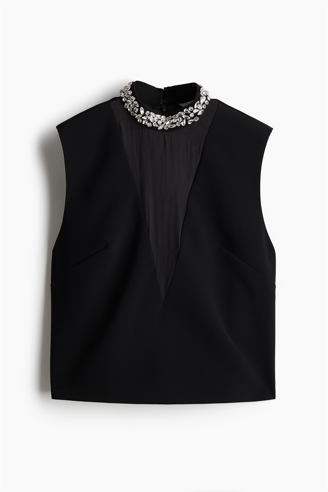 Топ без рукавов из тканого материала с украшенным стразами воротником-стойкой, V-образной вставкой из прозрачного шифона спереди и отверстием для ключа с застежками-крючками и потайной молнией сзади. Атласная подкладка.