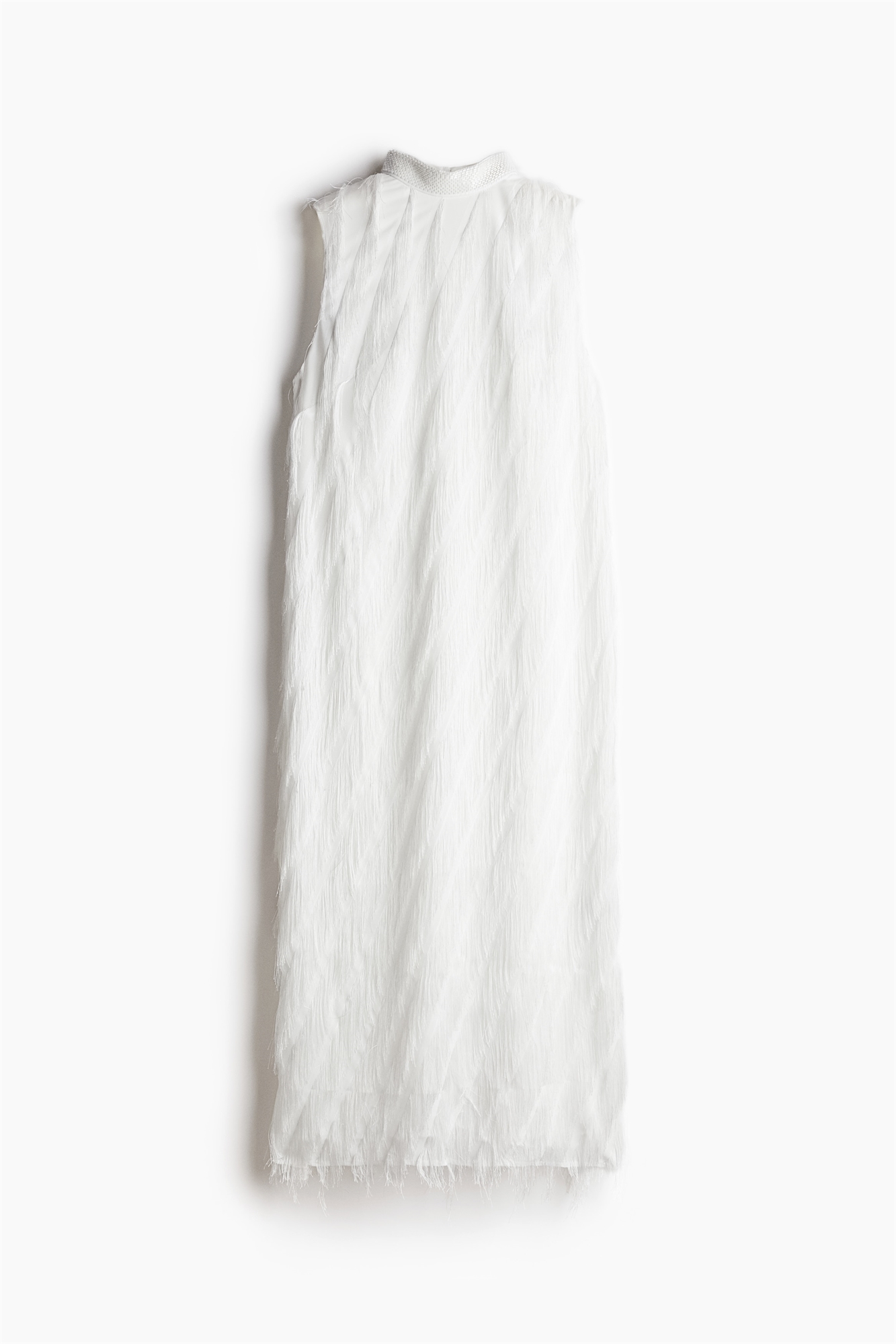 Платье без рукавов длиной до щиколоток из полотняного переплетения, украшенное мягкой бахромой в виде диагонального узора по всей поверхности. Воротник-стойка, украшенный бусинами, и отверстие для ключа с потайными пуговицами сзади на шее. Подол прямого кроя с разрезом сзади. Атласная подкладка.