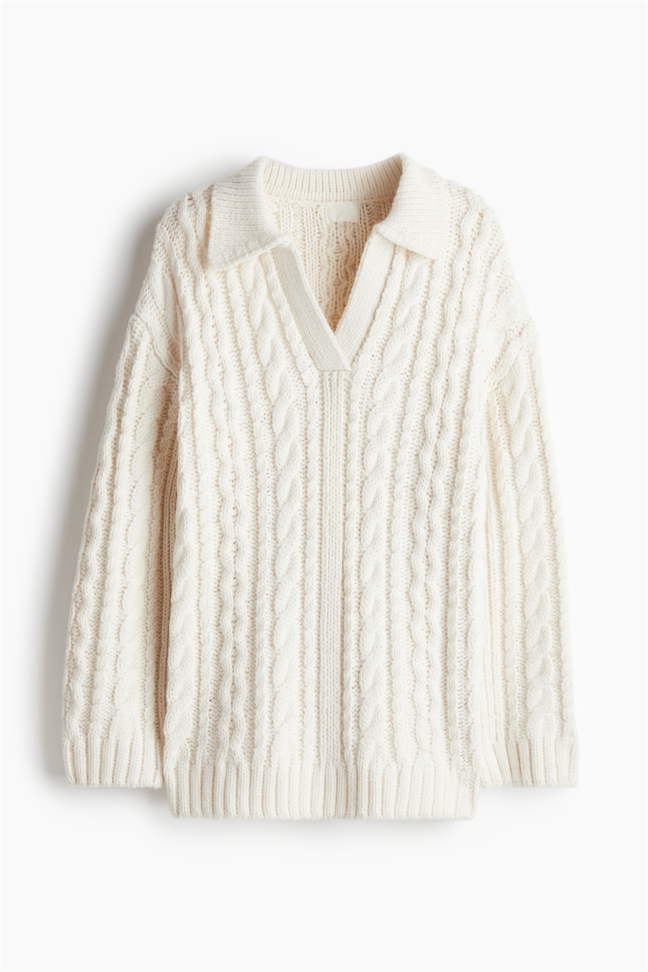 Джемпер свободного покроя из мягкого трикотажа в рубчик с воротником, V-образной проймой спереди, спущенными плечами и длинными рукавами. Ребристые манжеты и подол.