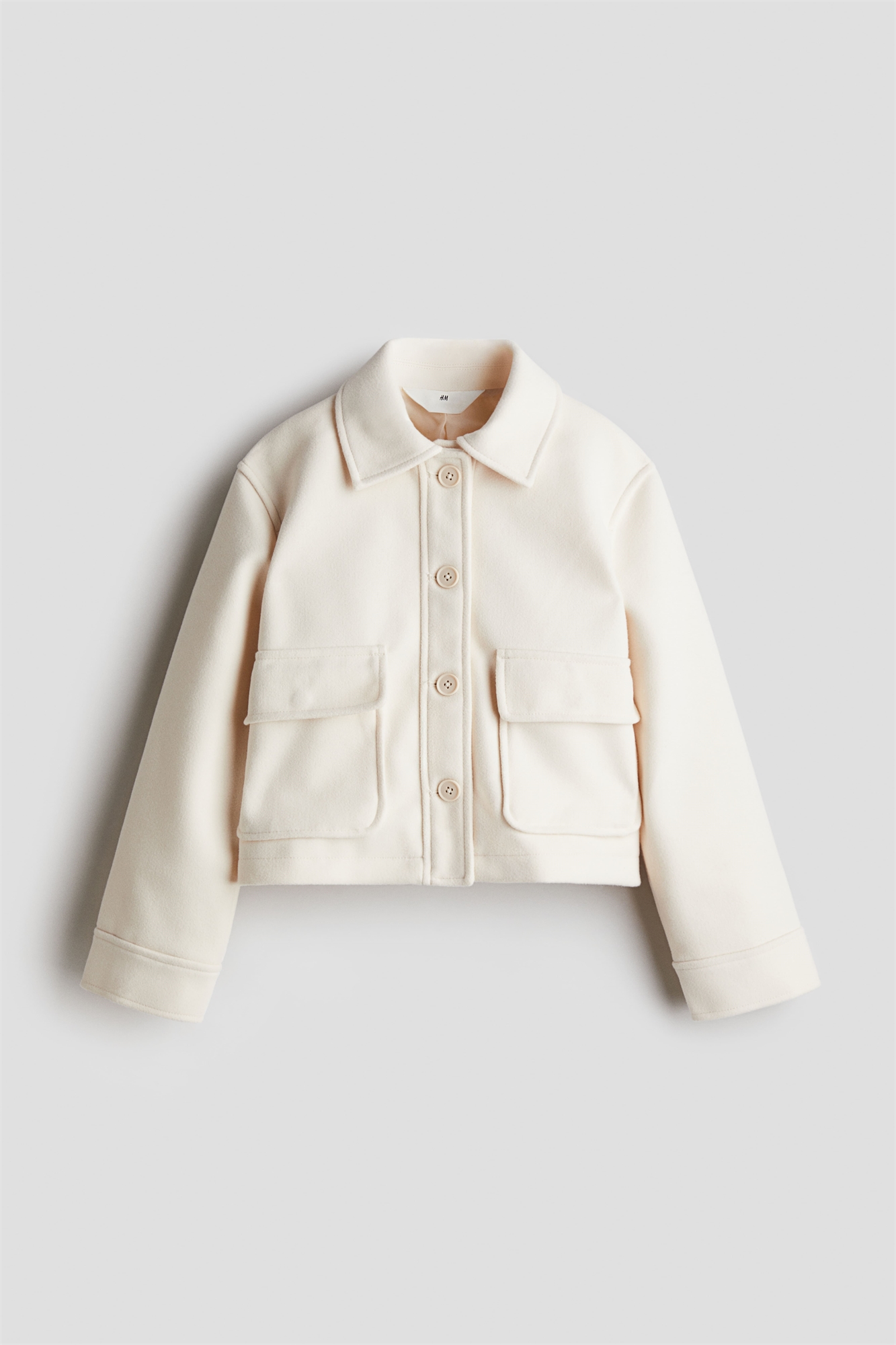 Короткая куртка из войлока с воротником, пуговицами спереди и ярмом сзади. Накладные передние карманы со скрытой застежкой, длинные рукава и манжеты на пуговицах. Подол прямого кроя.
