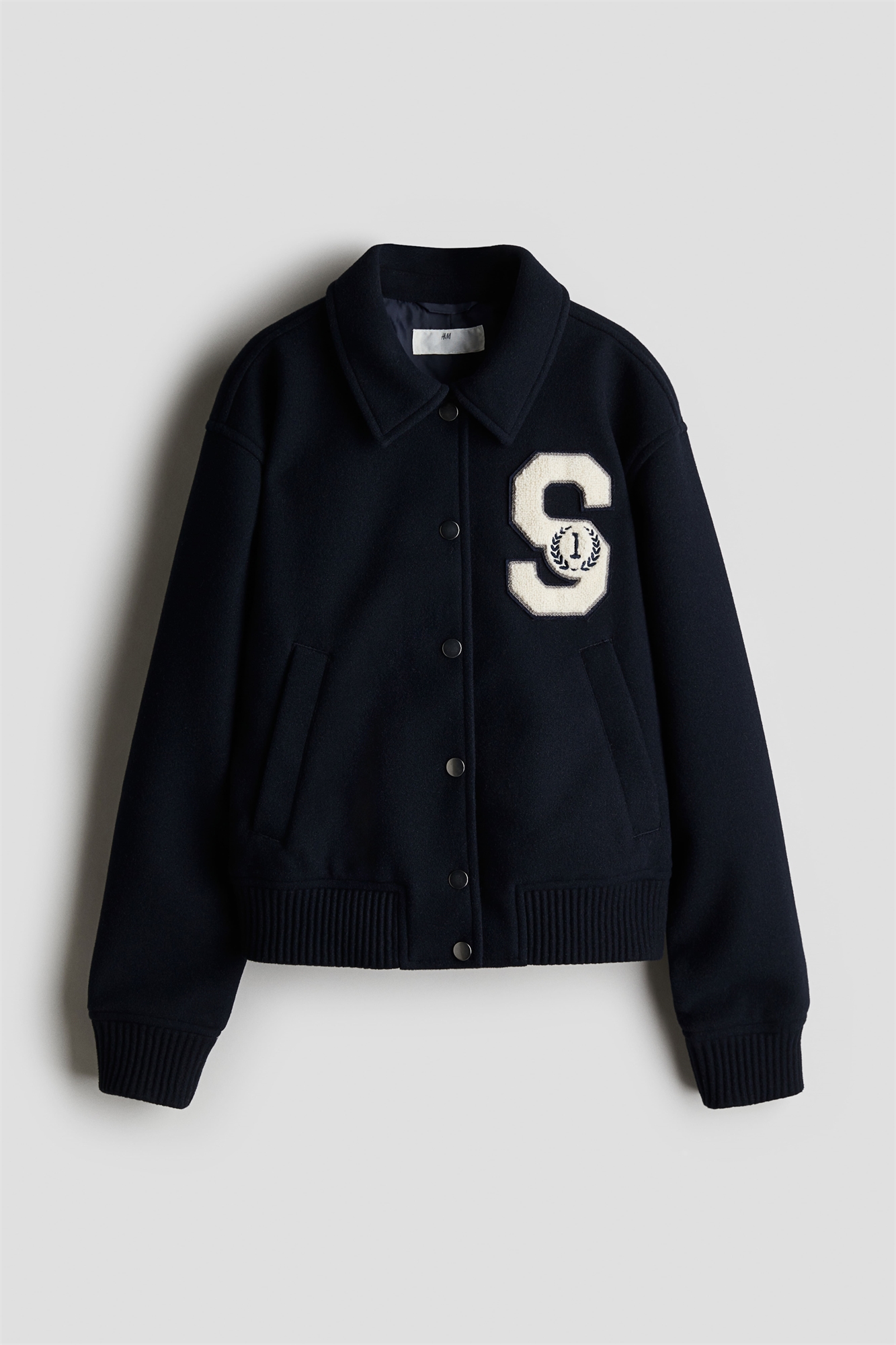 Бейсбольная куртка со значком. Воротник, застежки на кнопки спереди и передние карманы с потайной кнопкой. Ребристые манжеты и подол. На подкладке.