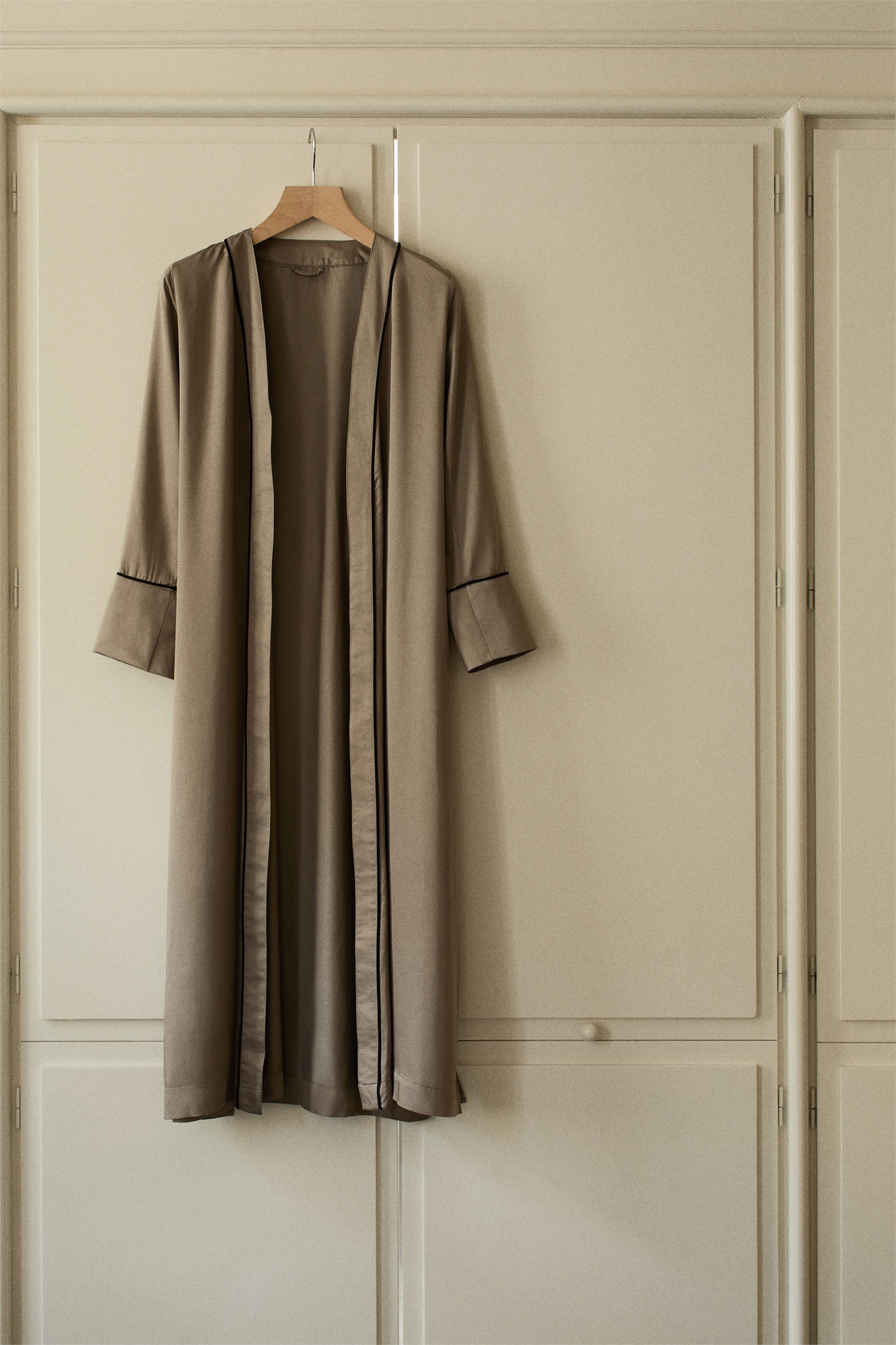 Халат из мягкого, легкого атласа с шалевым воротником и съемным поясом. Идеально подходит для неспешных воскресных дней.