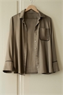 Пижама из мягкого, струящегося атласа с контрастной цветной отделкой. Верхняя часть с отложным воротником, потайной застежкой на пуговицы, длинными рукавами и открытым нагрудным карманом. Брюки с эластичным поясом на резинке, карманами в боковых швах и широкими штанинами.