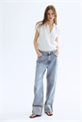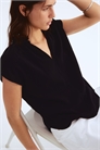 Свободная блузка из мягкого хлопкового муслина с воротником с оборками, V-образной проймой спереди, рукавами-капельками и закругленным подолом.