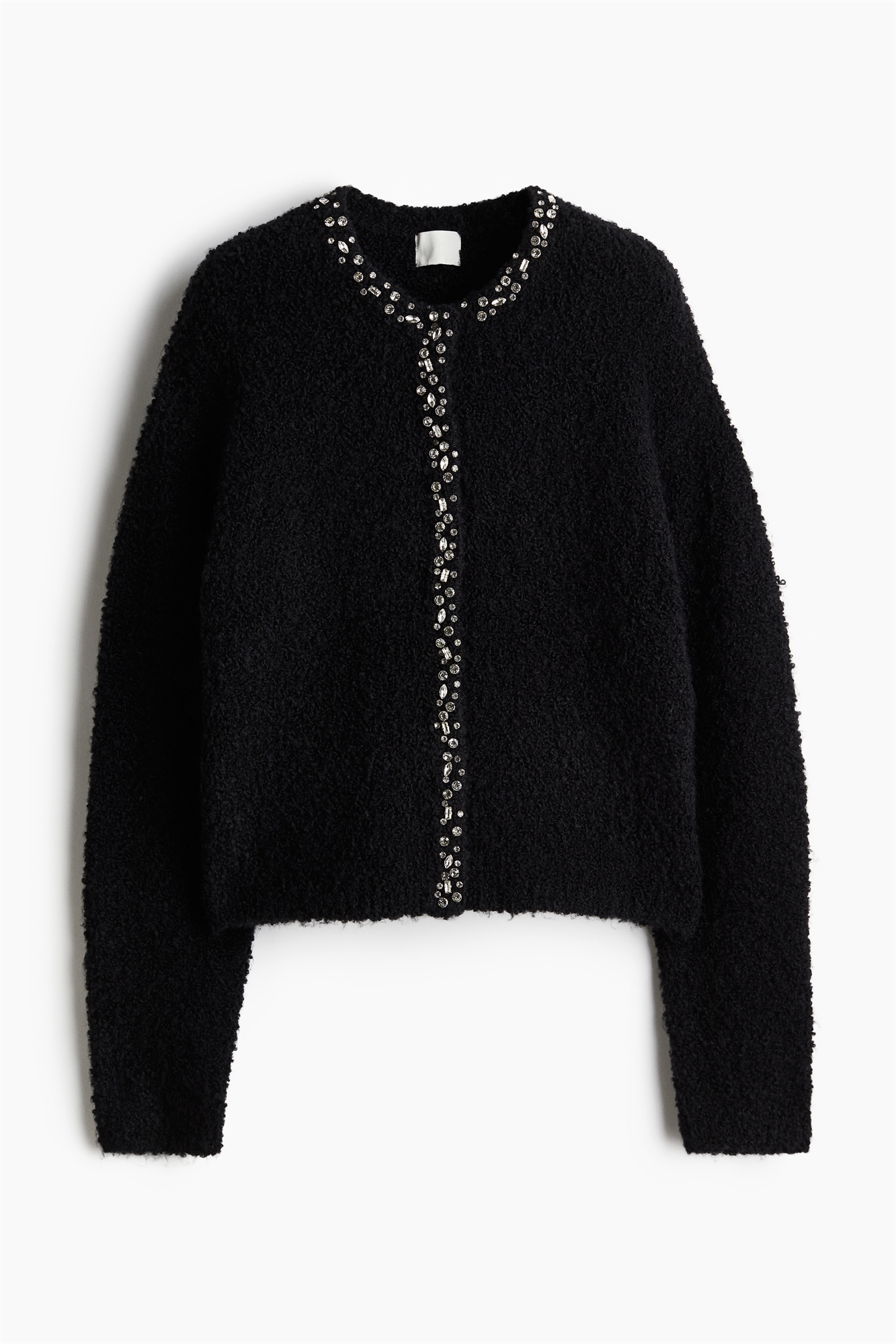Свободный кардиган из мягкого пушистого трикотажа с отделкой из сверкающих страз по вырезу горловины и по пуговичной ленте. Спущенные плечи и длинные рукава. Ребристые манжеты и подол.