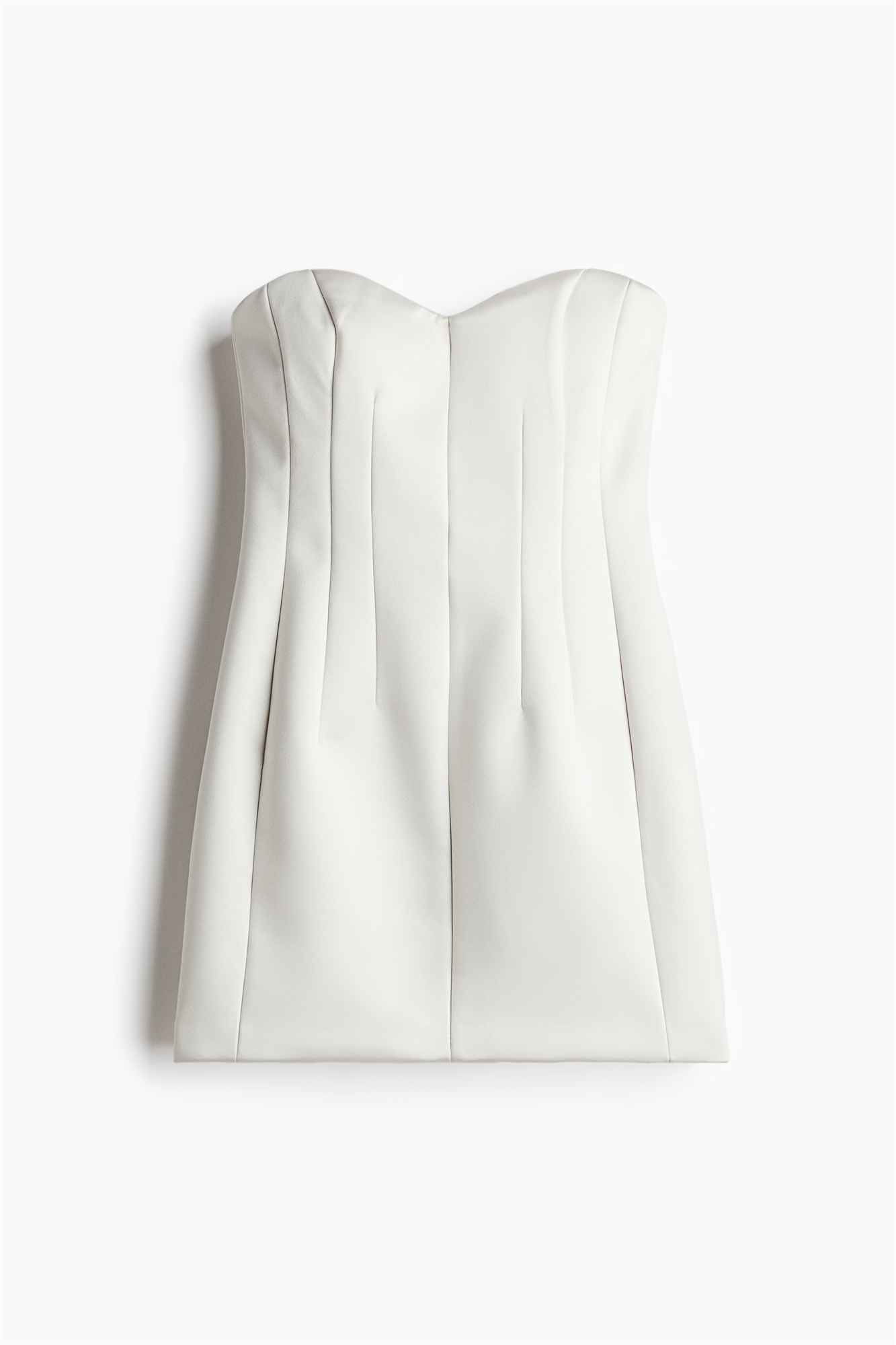 Короткое приталенное платье-бандо из прочной саржи с блестящим блеском с вырезом в форме сердца и скрытой силиконовой отделкой в верхней части. Скрытая застежка-молния и застежка-крючок сзади, формирующие швы спереди и сзади для создания привлекательного силуэта "песочные часы". На подкладке.