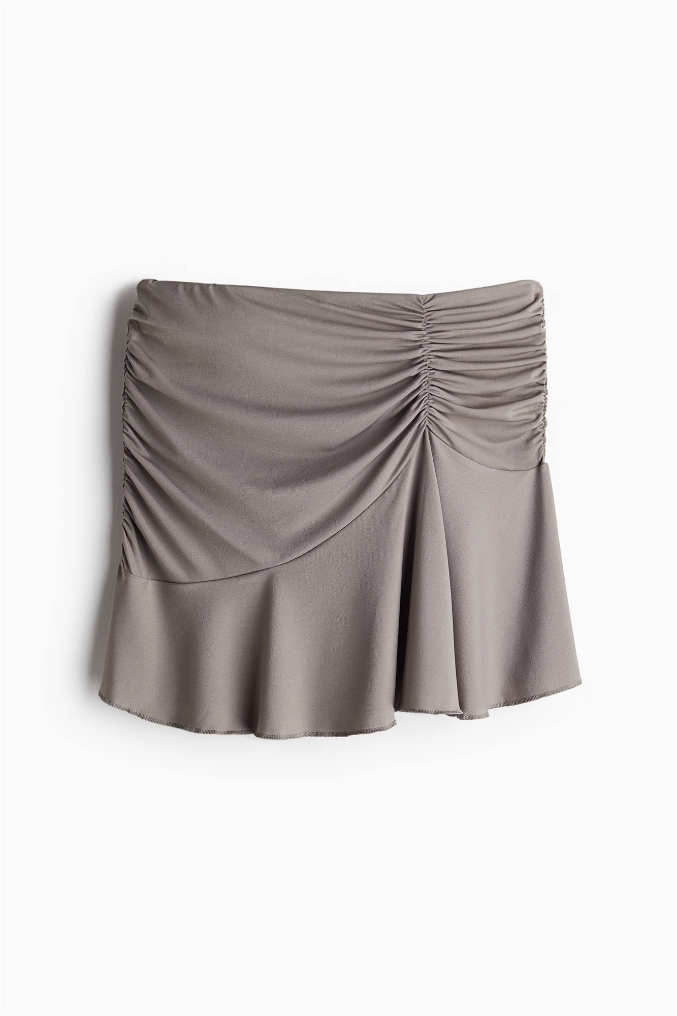 Облегающая юбка-мини из джерси-стрейч со скрытой эластичной резинкой на талии. Сборчатые швы спереди, сзади и по бокам создают эффект легкой драпировки. Асимметричный шов на бедрах и широкий оверлочный волан на подоле.