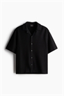Рубашка с короткими рукавами из ребристого трикотажа с воротником с отворотом, французской застежкой, задними складками и прямым подолом с боковыми разрезами. Свободный крой с объемным, но не чрезмерно большим силуэтом.