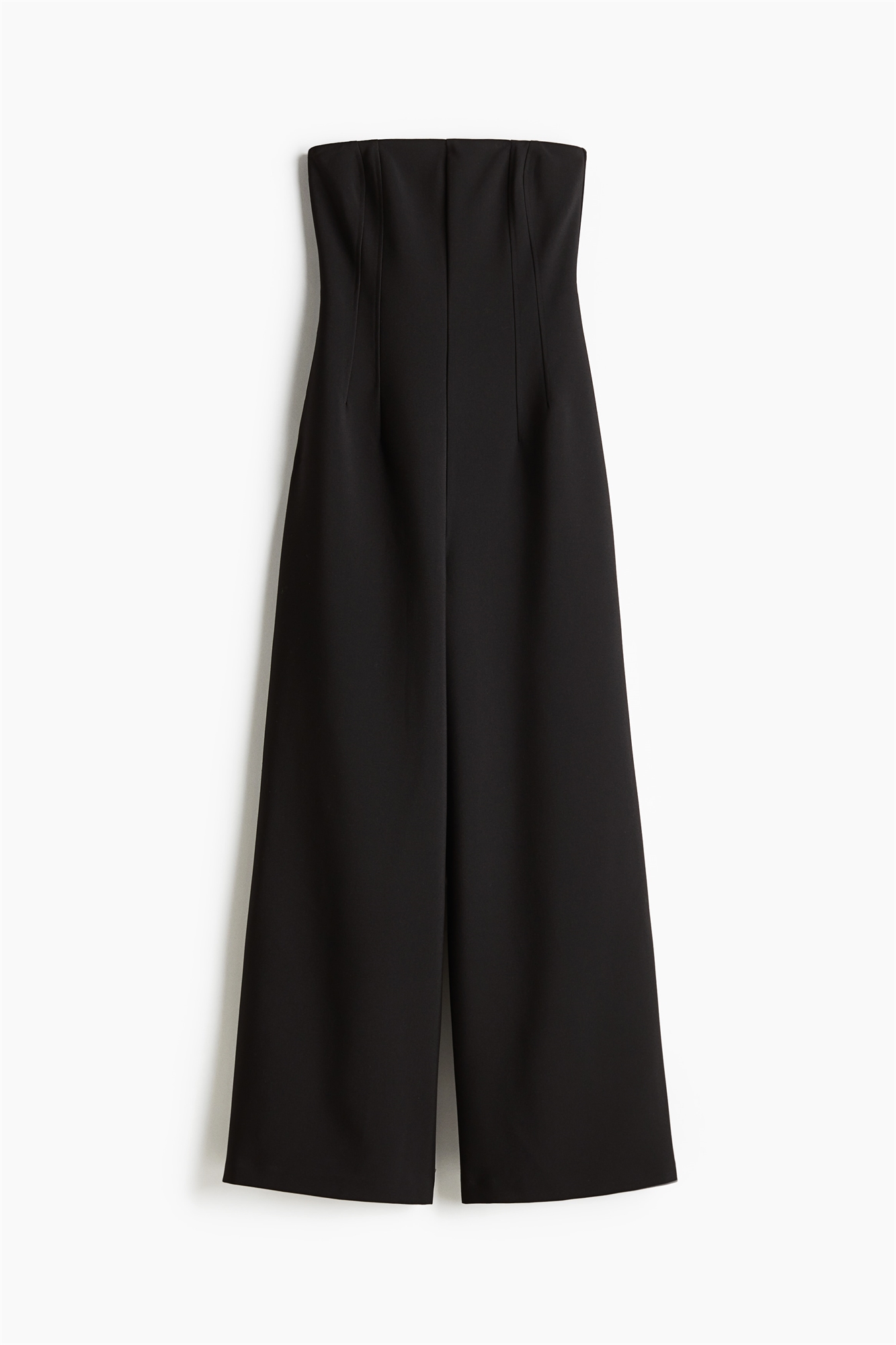 Приталенный комбинезон-бандо из саржи с приталенным лифом со скрытой силиконовой отделкой в верхней части и видимыми швами с косточками для придания формы и поддержки. Поставляется с узкими регулируемыми бретелями для дополнительного использования. Скрытая застежка-молния и застежка-крючок сзади, широкие ноги.