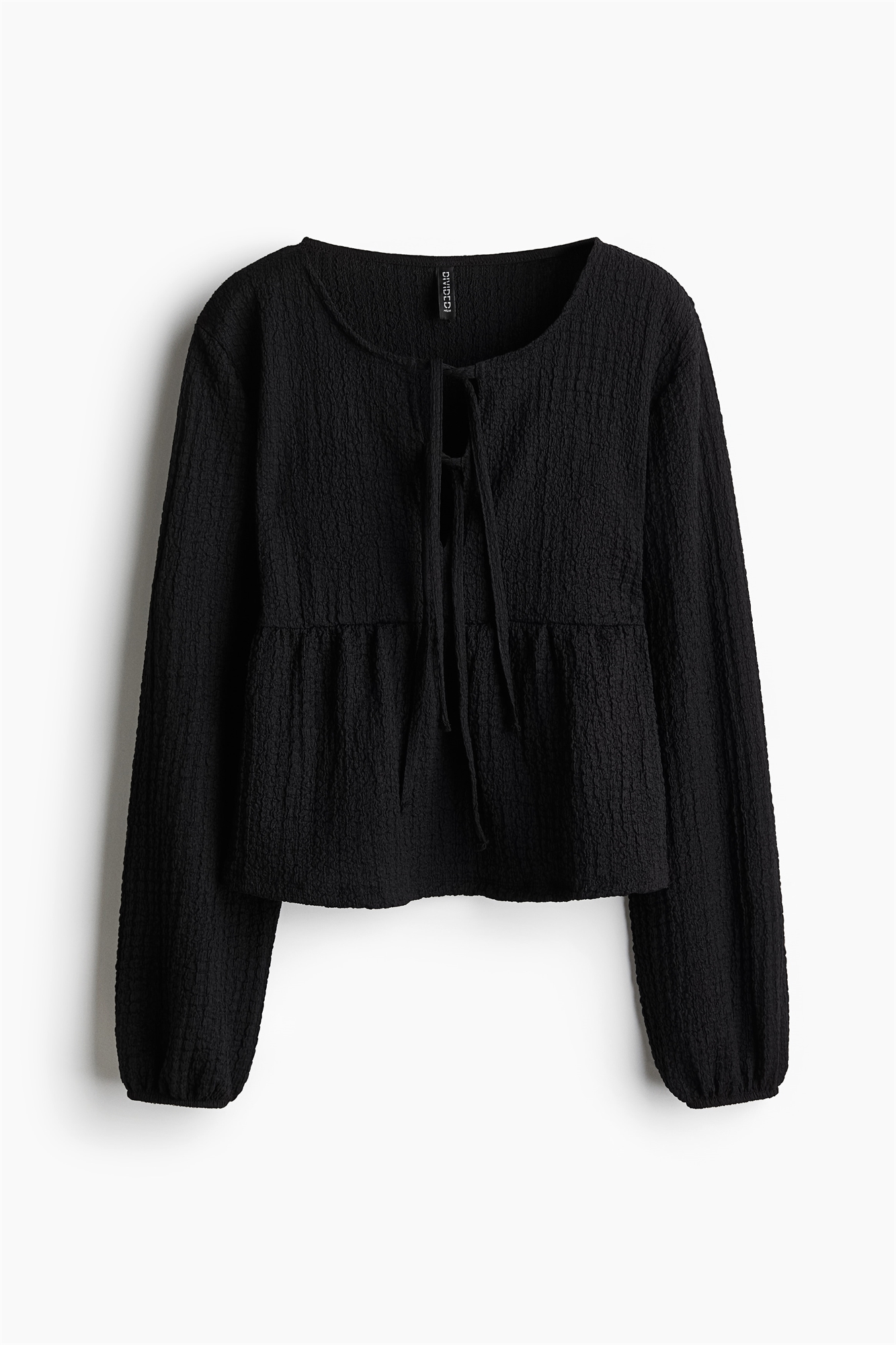 Топ из мятого джерси с круглым вырезом горловины с V-образной проймой и двумя парами узких завязок спереди. Длинные рукава с эластичными манжетами, сборчатый шов на талии и мягкий расклешенный живот.