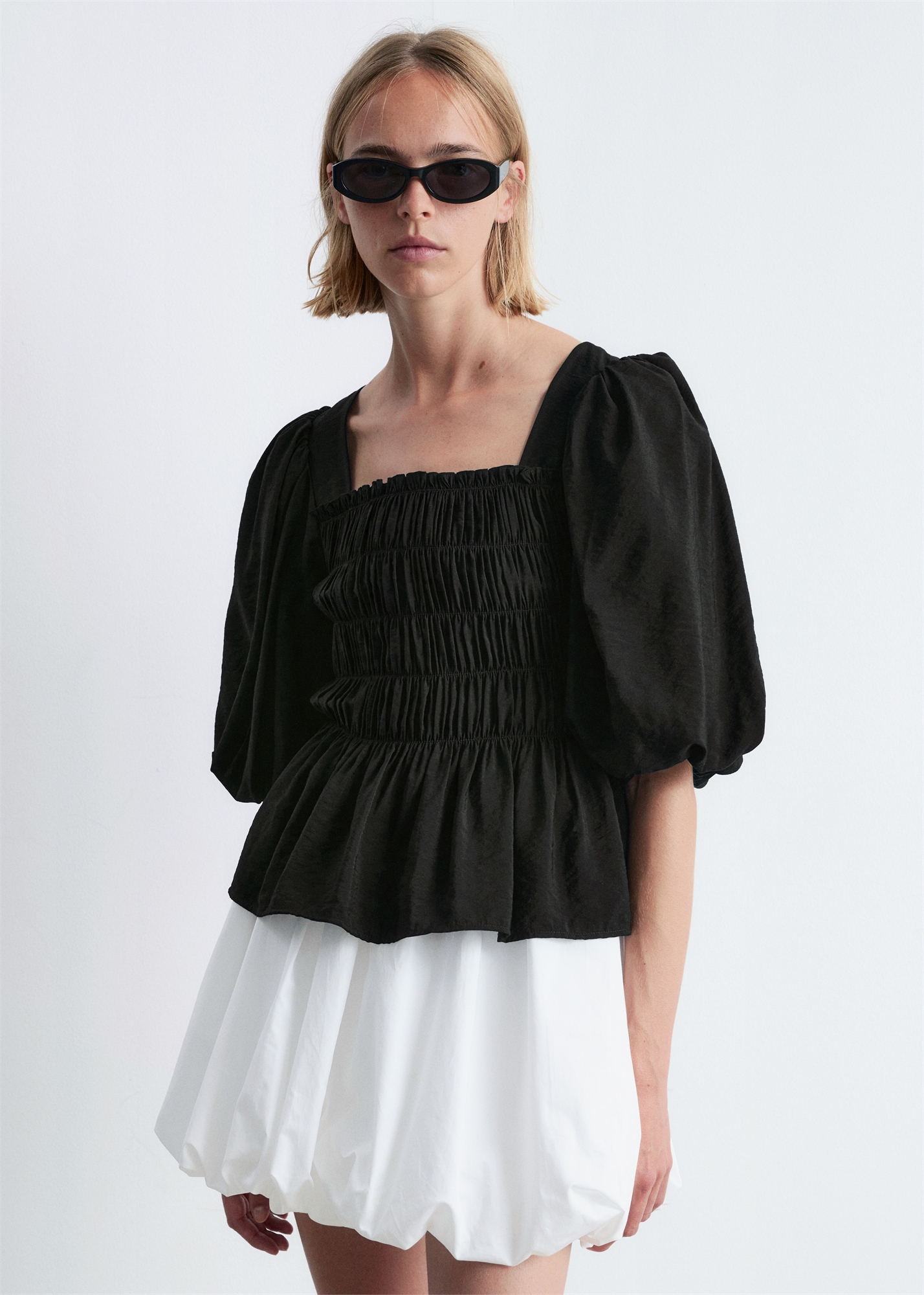 Блузка с квадратным вырезом горловины, короткими объемными рукавами-пуховиками и платочной вставкой, переходящей в подол-пеплум. Длина блузки: 55 см / 21,7" (размер S)