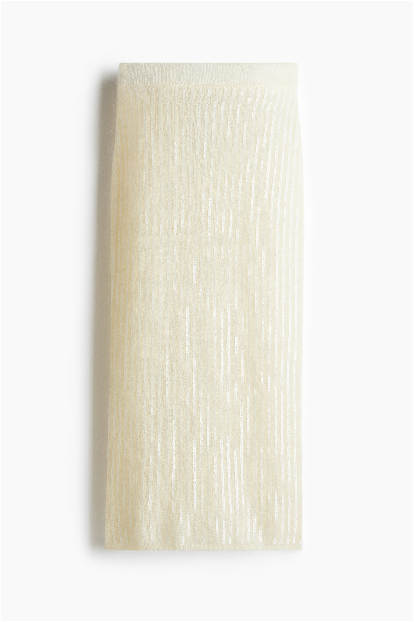 Приталенная юбка длиной до щиколоток из мягкого трикотажа с мохером и шерстью. Вертикальные полоски с блестками, эластичная резинка на талии и узкая тесьма по подолу.