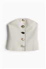 Облегающий топ-бандо из плотного трикотажа с пришитыми спереди привлекательными металлическими пуговицами разной формы и дизайна.