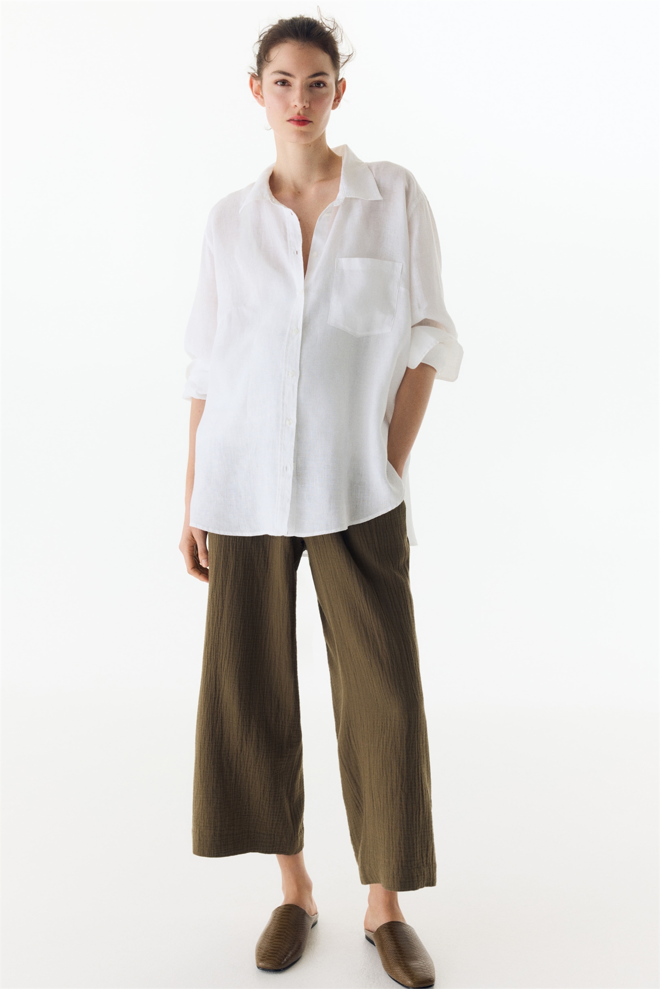 Брюки длиной до щиколоток из мягкого хлопкового муслина с заниженной эластичной талией с небольшой оборкой и узким шнурком. Свободный крой с диагональными боковыми карманами и широкими ногами.