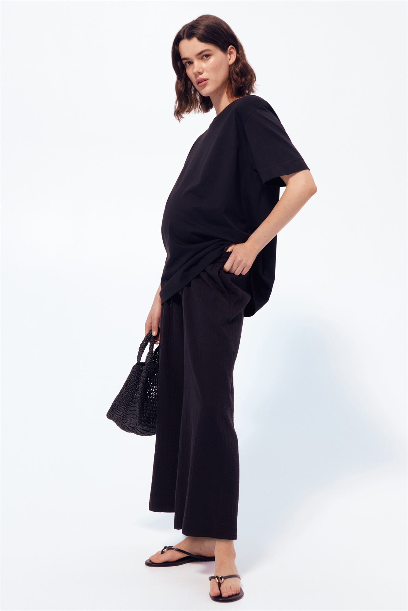 Брюки длиной до щиколоток из мягкого хлопкового муслина с заниженной эластичной талией с небольшой оборкой и узким шнурком. Свободный крой с диагональными боковыми карманами и широкими ногами.