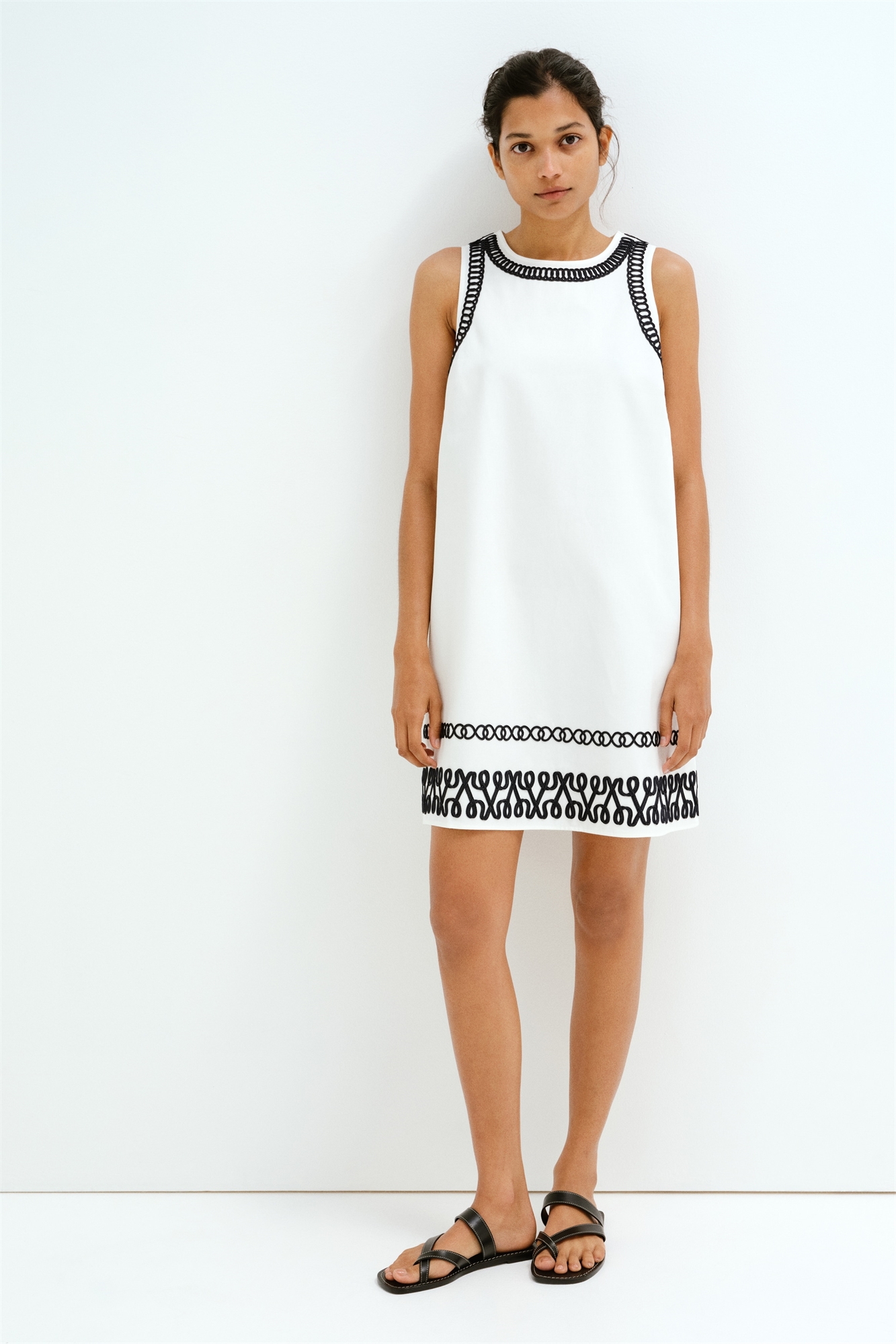 Короткое платье без рукавов из саржи, украшенное вышивкой акцентного цвета. Круглый вырез и прорезь для ключа с потайной пуговицей сзади на шее. Без подкладки. Платье можно носить как во время, так и после беременности.