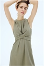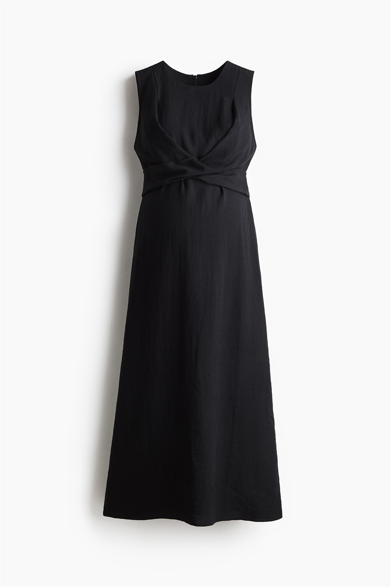 Платье для кормящих длиной до колен, без рукавов, с воздушным переплетением нитей из вискозной смеси. Круглый вырез и перекрестный разрез спереди с широкими завязками, которые обхватывают и застегиваются сзади. В дизайне предусмотрены незаметные отверстия спереди для облегчения доступа к груди. Потайная застежка-молния сзади. Без подкладки.
