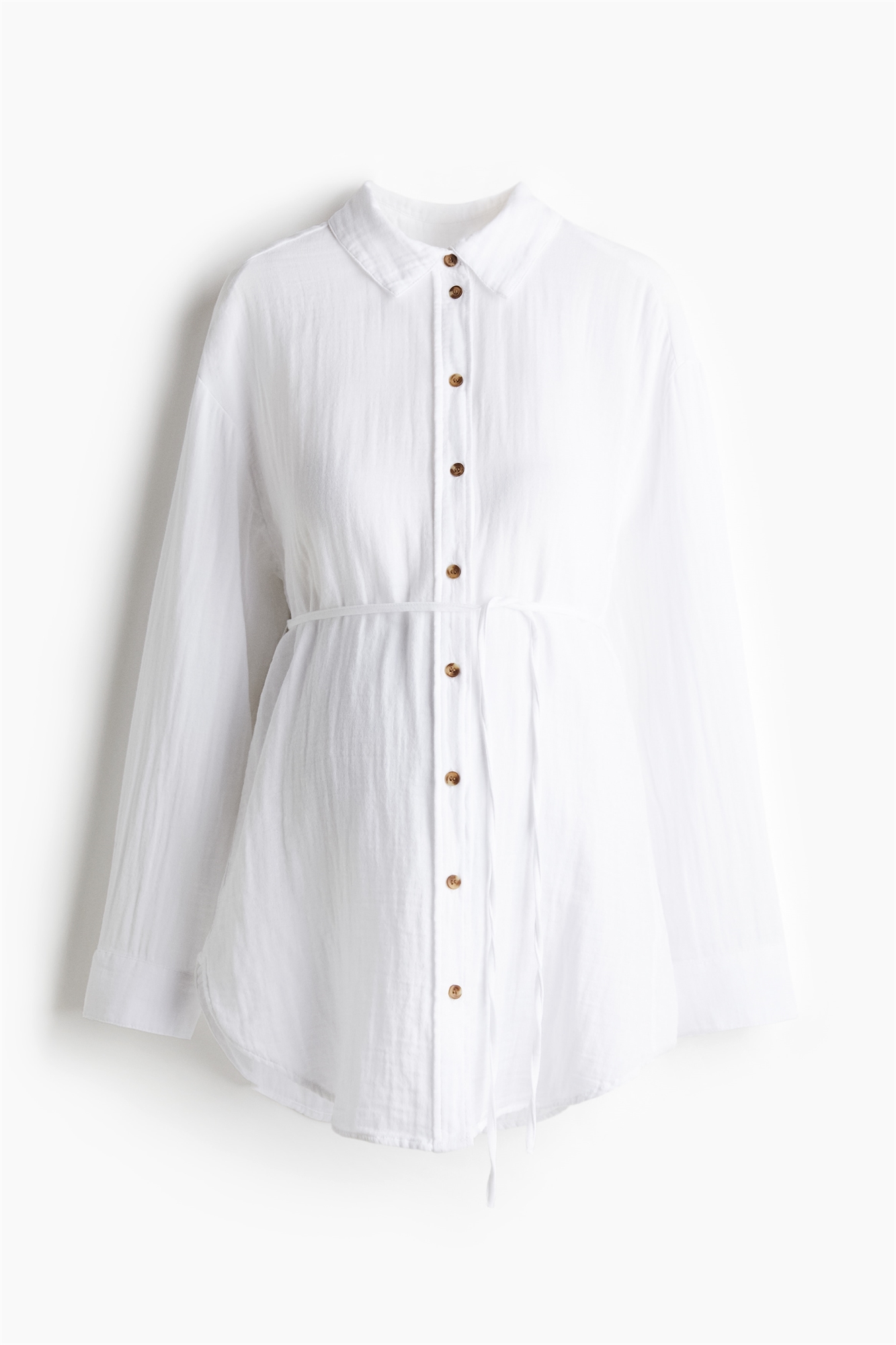 Свободная рубашка из мягкого хлопкового муслина с воротником и пуговицами спереди. Сзади - складка, слегка спущенные плечи и длинные рукава с манжетами на пуговицах. Узкий съемный пояс с завязками под бюстом. Закругленный подол с фигурными боковыми вентиляционными отверстиями. Рубашку можно носить как во время, так и после беременности.