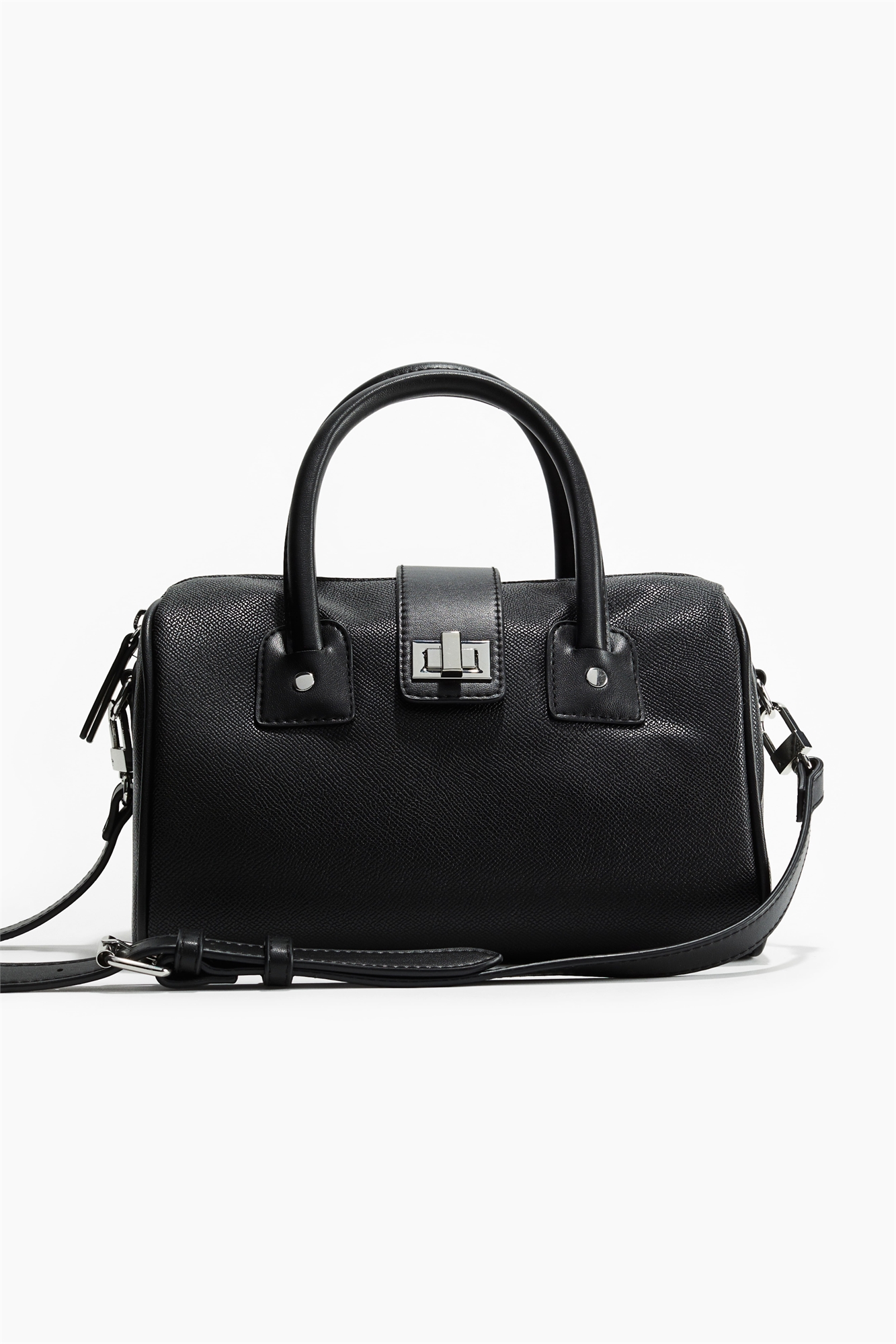 Сумка-кроссбоди из лакированной ткани с двумя ручками, застежкой-молнией, металлической застежкой и съемным регулируемым плечевым ремнем. Одно большое открытое внутреннее отделение. Металлические шипы внизу. На подкладке. Глубина 15 см. Высота 15 см. Ширина 25 см.