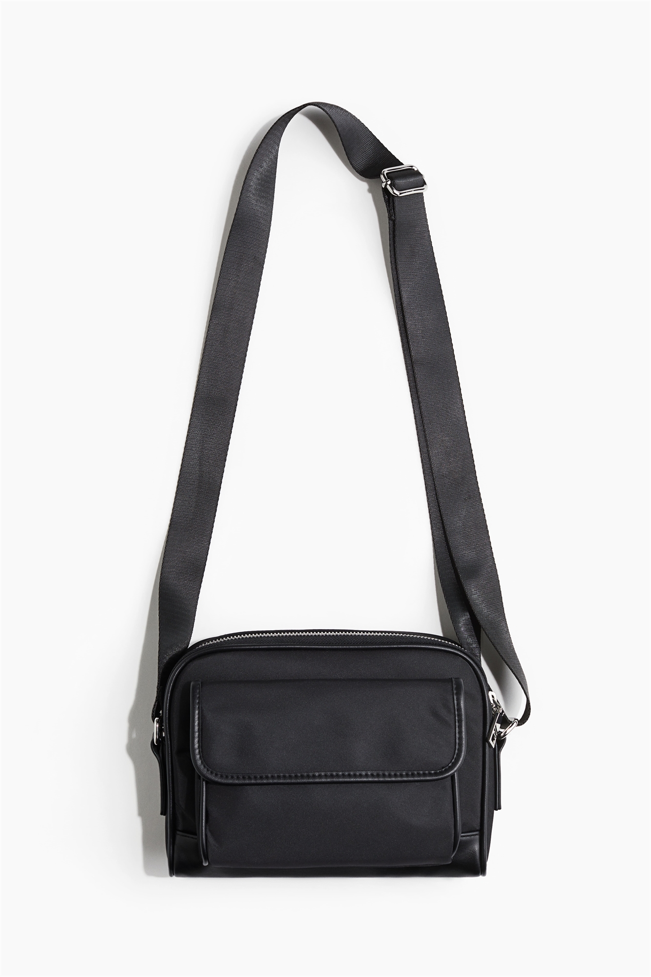 Сумка-кроссбоди из тканого материала с двусторонней застежкой-молнией в верхней части и регулируемым плечевым ремнем с застежкой-скобой. Одно открытое внешнее отделение и одно внешнее отделение с клапаном с потайной застежкой. Одно открытое внутреннее отделение. Высота 16 см. Ширина 22 см. На подкладке.