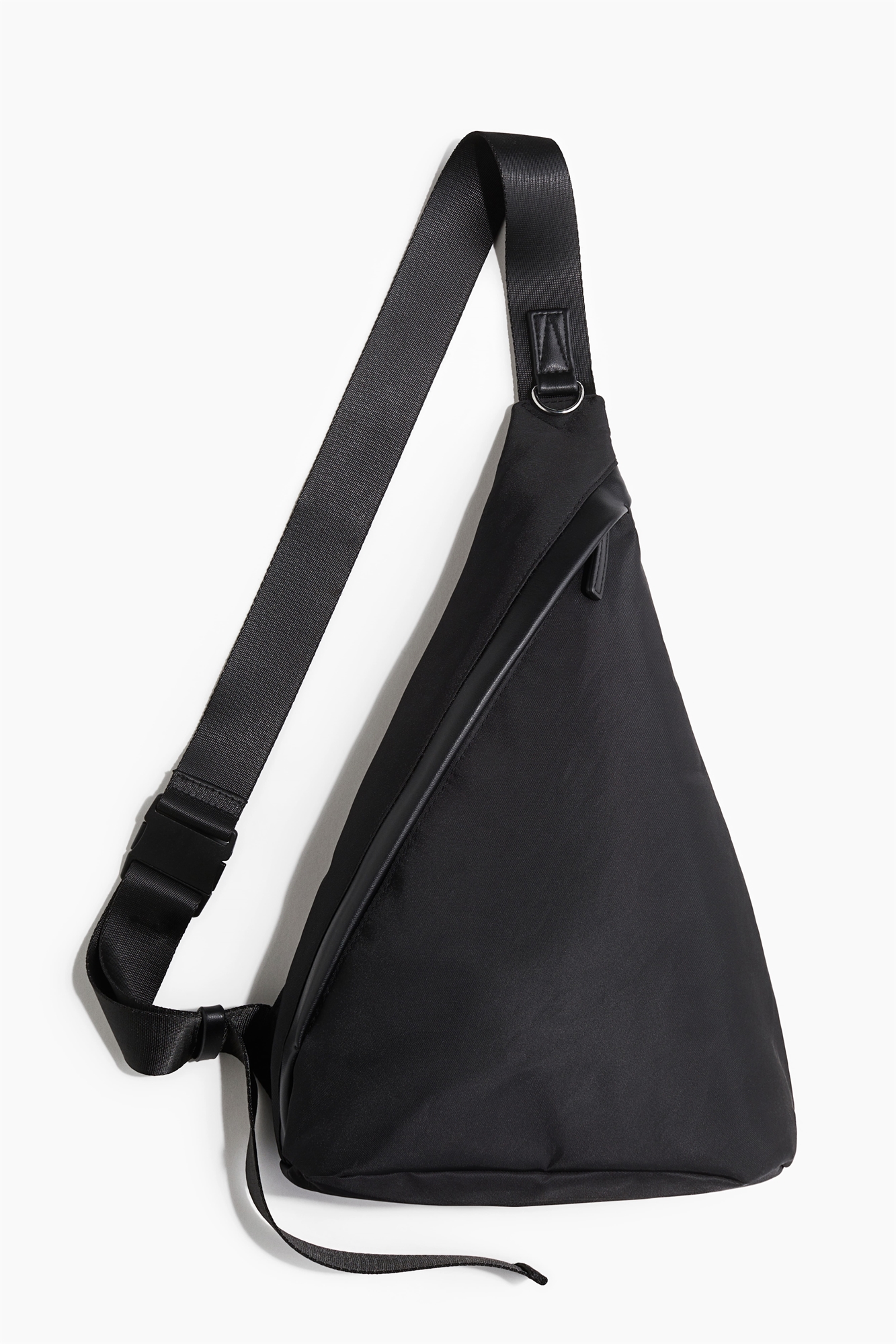 Сумка-слинг из тканого материала с застежкой на молнию спереди и регулируемым плечевым ремнем с пластиковой застежкой и металлическим D-кольцом. На подкладке.