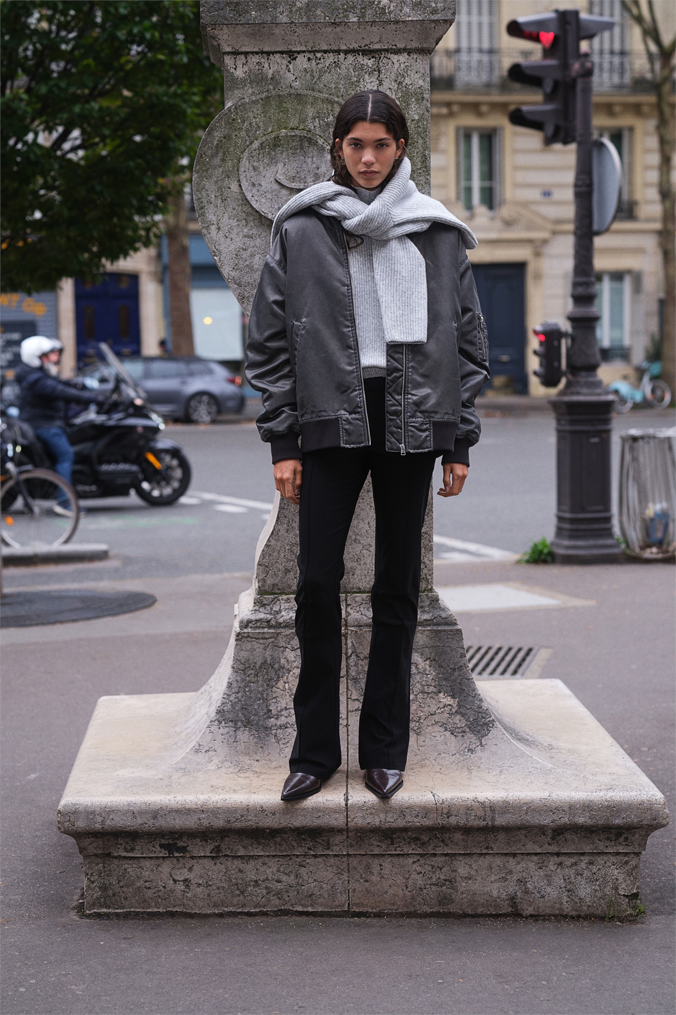 Облегающие брюки из эластичного полотна с ширинкой на молнии и скрытой застежкой на крючок и планку. Ноги со складками спереди и сзади и расклешенными подолами.