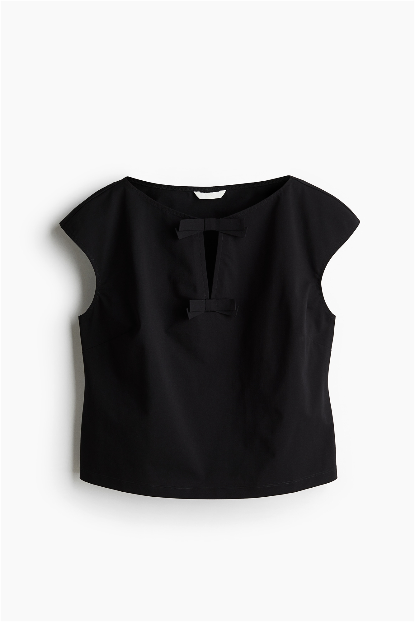 Короткий приталенный топ из крепового джерси с круглым вырезом и V-образной проймой с декоративными бантами спереди. Рукава-капельки и подол прямого кроя с небольшим разрезом с каждой стороны.