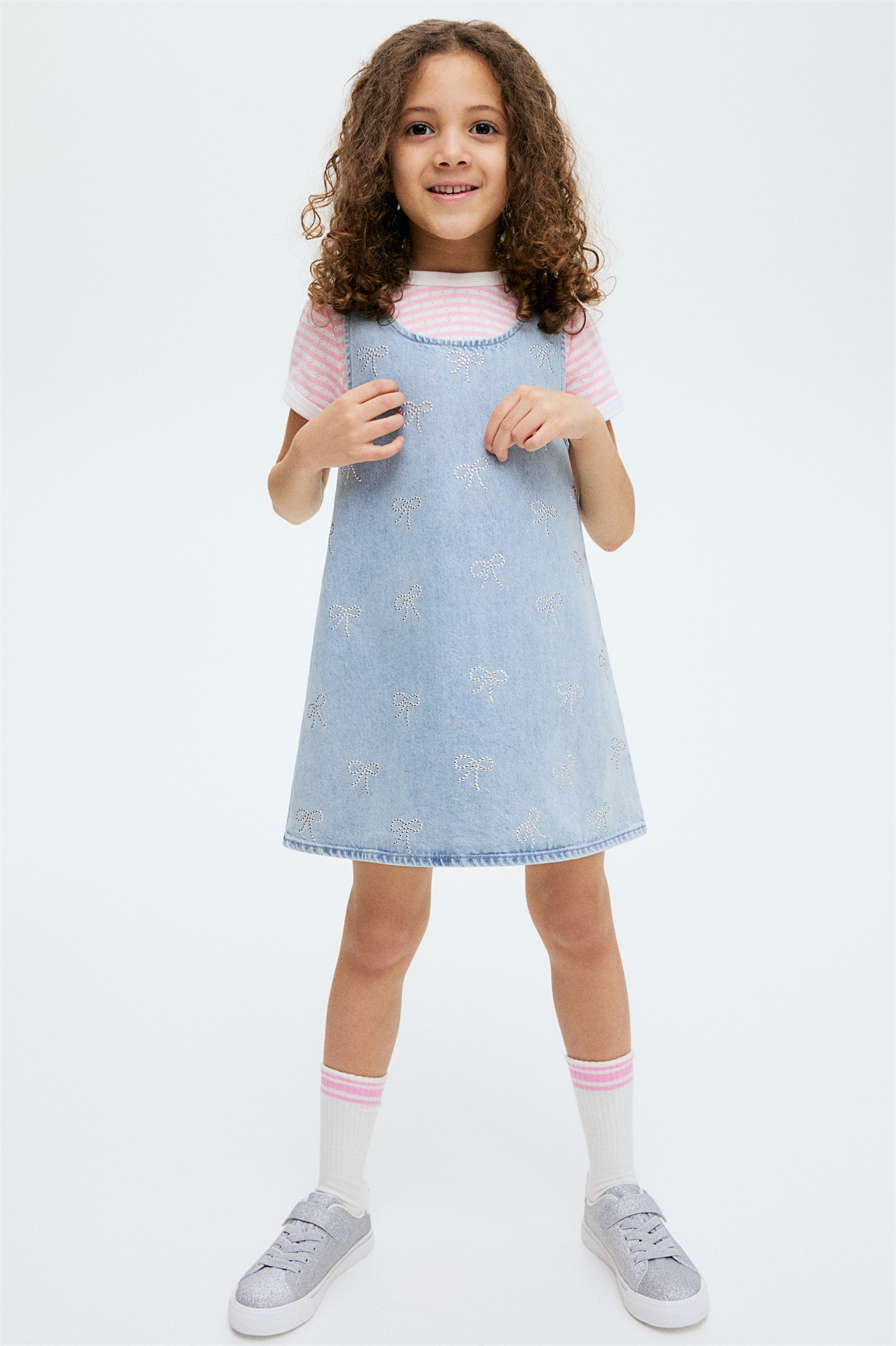 Платье А-линии из мягкого хлопкового денима с украшениями из страз. Круглый вырез, широкие бретели и прямой подол.