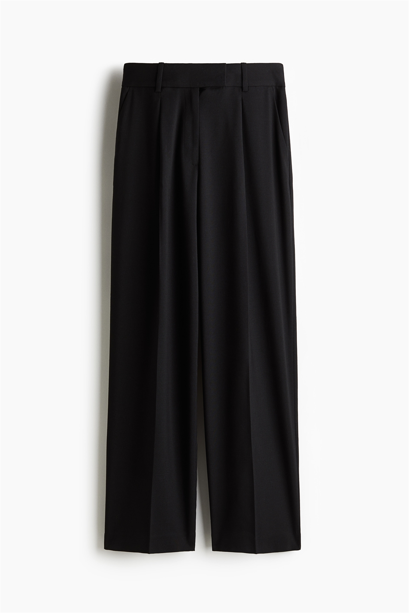 Приталенные брюки из тканого материала с высокой талией, ширинкой на молнии и удлиненным поясом со скрытой пуговицей и застежками-крючками. Свободный крой с диагональными боковыми карманами, втачными карманами сзади и прямыми ногами со складками спереди и складками спереди и сзади.