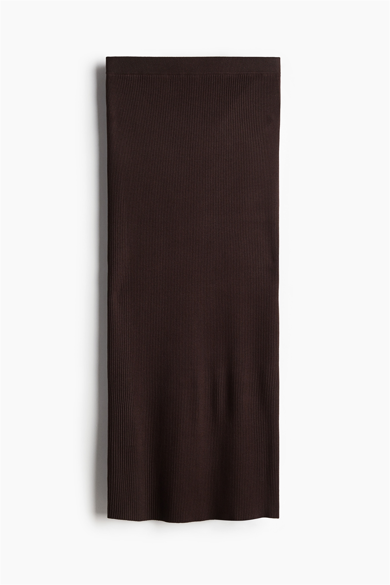 Приталенная юбка длиной до колен из мягкого трикотажа в рубчик с высокой эластичной талией и прямым подолом с разрезом сзади.