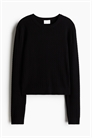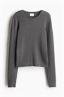 Джемпер из мягкого трикотажа в рубчик с круглым вырезом в рубчик, спущенными плечами и длинными рукавами. Ребристые манжеты и подол.
