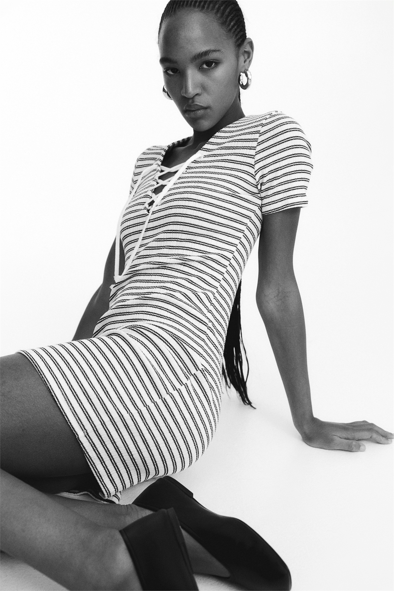 Короткое приталенное платье из ребристого трикотажа с V-образным вырезом и шнуровкой спереди. Короткие рукава и прямой подол.