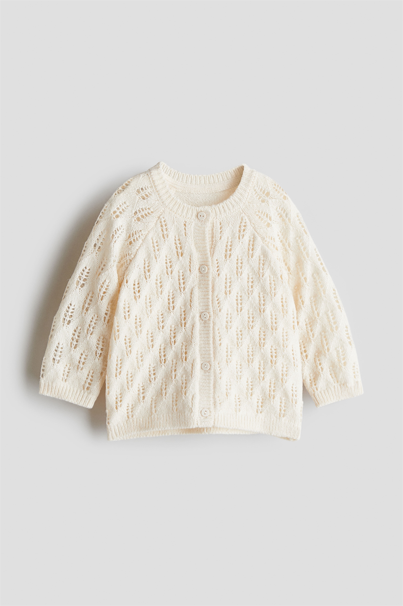 Кардиган из мягкого трикотажа пуантель с круглым вырезом, отделанным ребрами, пуговицами спереди и длинными рукавами реглан. Ребристая отделка по краю пуговиц, манжетам и подолу.