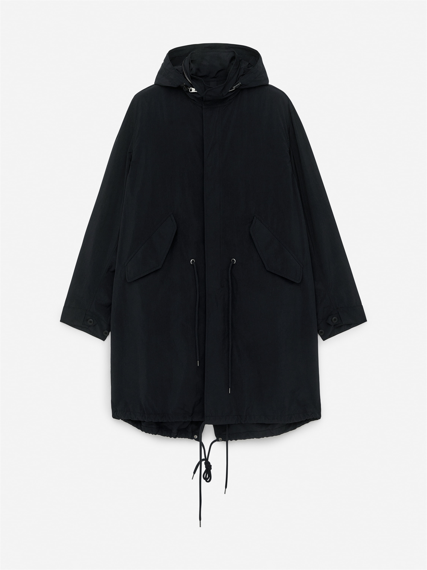Парка Fishtail из нейлона с водонепроницаемыми свойствами. Слегка удлиненный фасон с высоким воротником, откидывающимся капюшоном, передней планкой со скрытыми кнопками и двусторонней застежкой-молнией, двумя большими карманами с клапанами и одним внутренним карманом. Утяжка на талии и по подолу. Эластичная вставка с пуговицей для регулировки ширины манжет. Капюшон с утягивающим шнурком. Эта одежда входит в серию 2 в 1 - модульную систему верхней одежды, которая включает в себя оболочку и утепляющий вкладыш, специально разработанные для того, чтобы соединяться вместе, образуя полностью мягкое пальто.