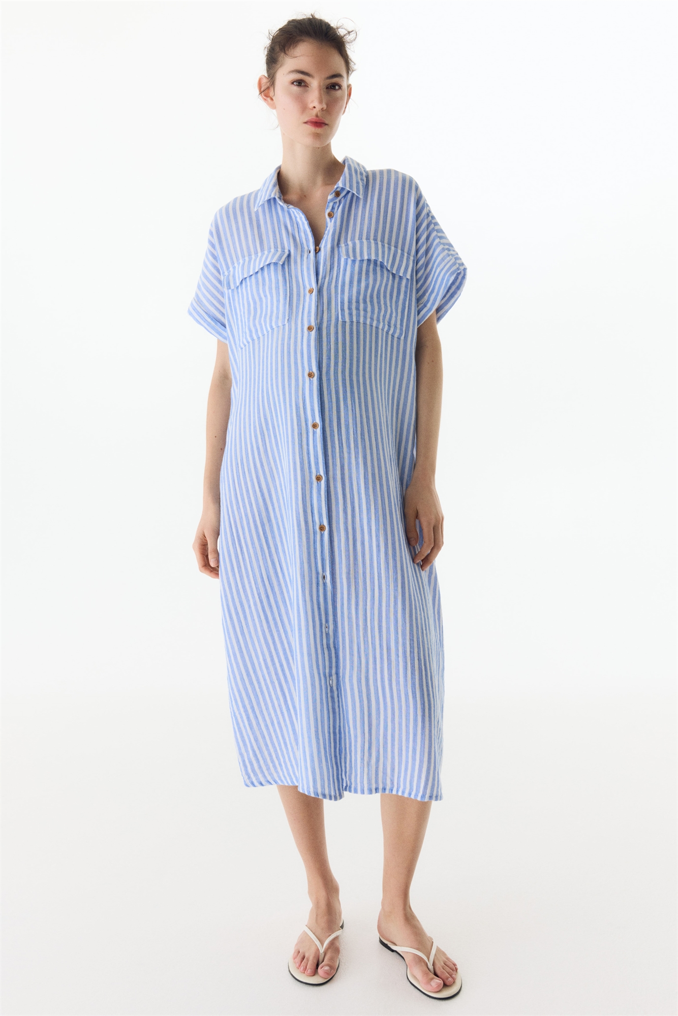 Платье длиной до колена из мягкого хлопкового муслина с воротником и пуговицами спереди. Короткие рукава с вшитыми оборочками и съемный пояс-завязка под бюстом. Подол прямого покроя. Без подкладки.