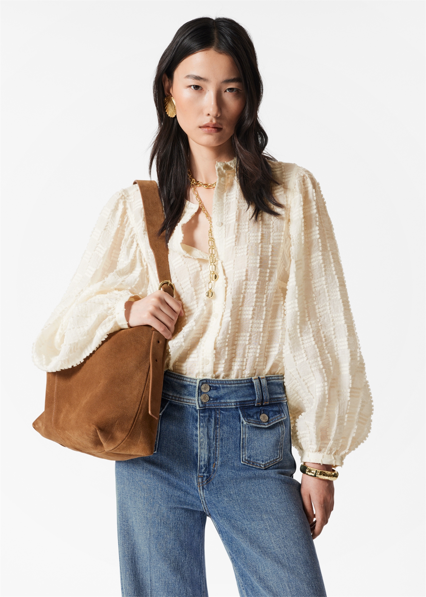 Блузка с фактурной отделкой и объемными рукавами. • Застежка на семь пуговиц • Манжеты на пуговицах • Длина блузки: 68,5 см / 27" (размер S)