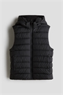 Мягкая жилетка из стеганого полотна со съемным капюшоном. Воротник-стойка, застежка-молния спереди с защитой подбородка от натирания и скрытые боковые карманы со скрытой застежкой на кнопках. На подкладке.