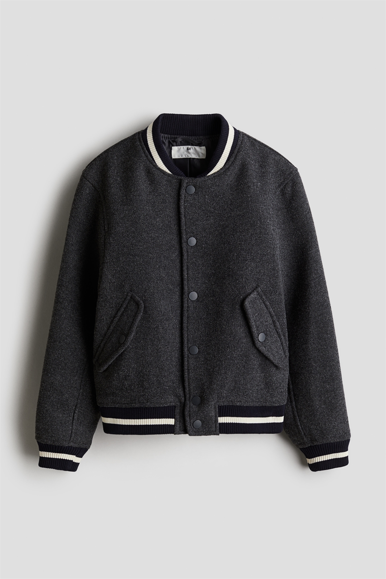 Бейсбольная куртка из войлока с ребристым воротником-стойкой, застежками на кнопки спереди и диагональными передними карманами с клапаном и застежкой на кнопки. Ребристые манжеты и подол. На подкладке.